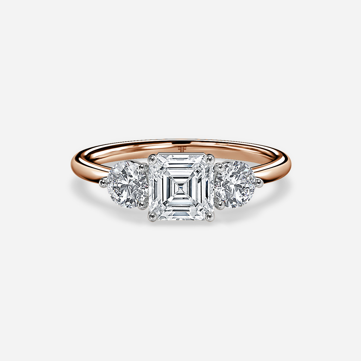 This rose gold two tone three stone trinity engagement ring set in eagle claws is a sure stunner. This ring features two exquisite side stone round diamonds that enhance the centre stone, telling the past, present and future tale of your relationship. Handcrafted in Hatton Gardens, London. Centre Diamond Not Included Setting only