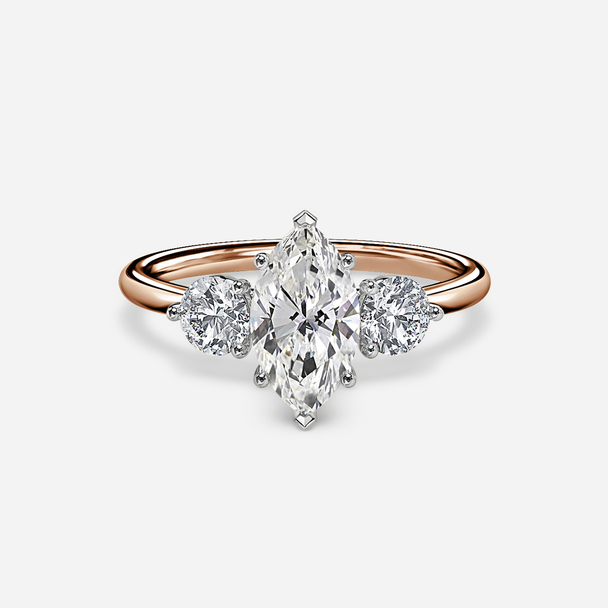 This rose gold two tone three stone trinity engagement ring set in eagle claws is a sure stunner. This ring features two exquisite side stone round diamonds that enhance the centre stone, telling the past, present and future tale of your relationship. Handcrafted in Hatton Gardens, London. Centre Diamond Not Included Setting only