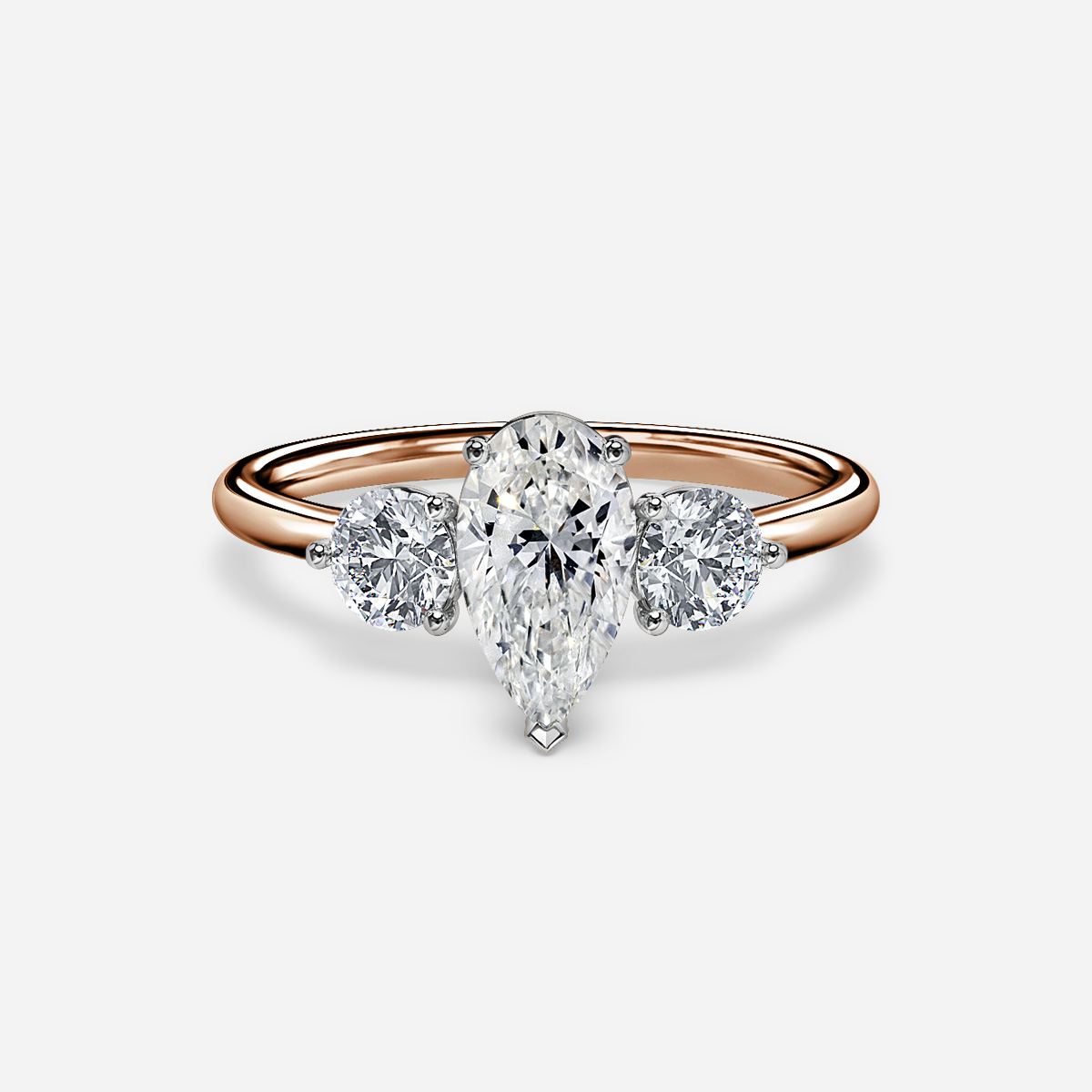 This rose gold two tone three stone trinity engagement ring set in eagle claws is a sure stunner. This ring features two exquisite side stone round diamonds that enhance the centre stone, telling the past, present and future tale of your relationship. Handcrafted in Hatton Gardens, London. Centre Diamond Not Included Setting only