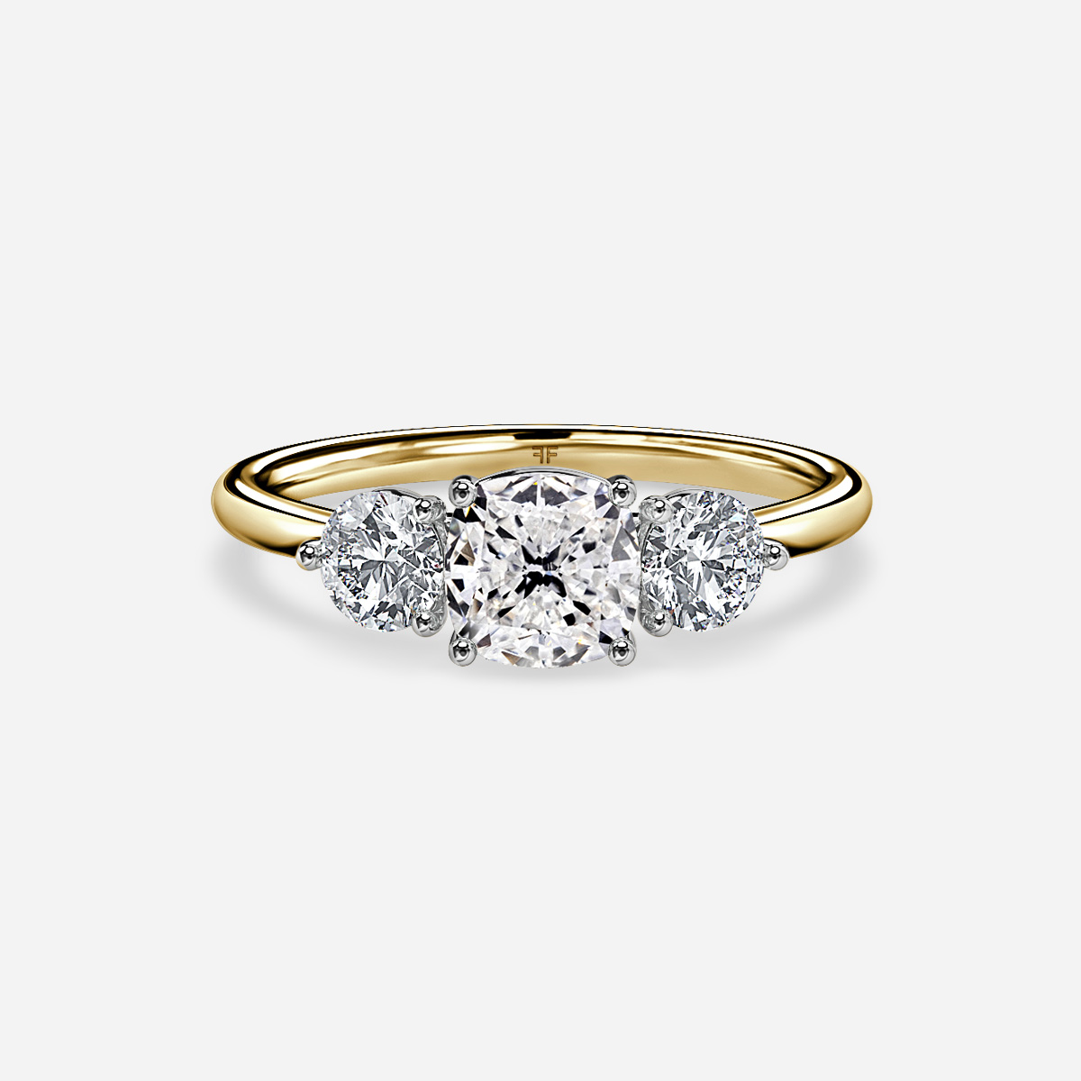 This yellow gold two tone three Stone trinity engagement ring set in eagle claws is a sure stunner. This ring features two exquisite side stone round diamonds that enhance the centre stone, telling the past, present and future tale of your relationship. Handcrafted in Hatton Gardens, London. Centre Diamond Not Included Setting only