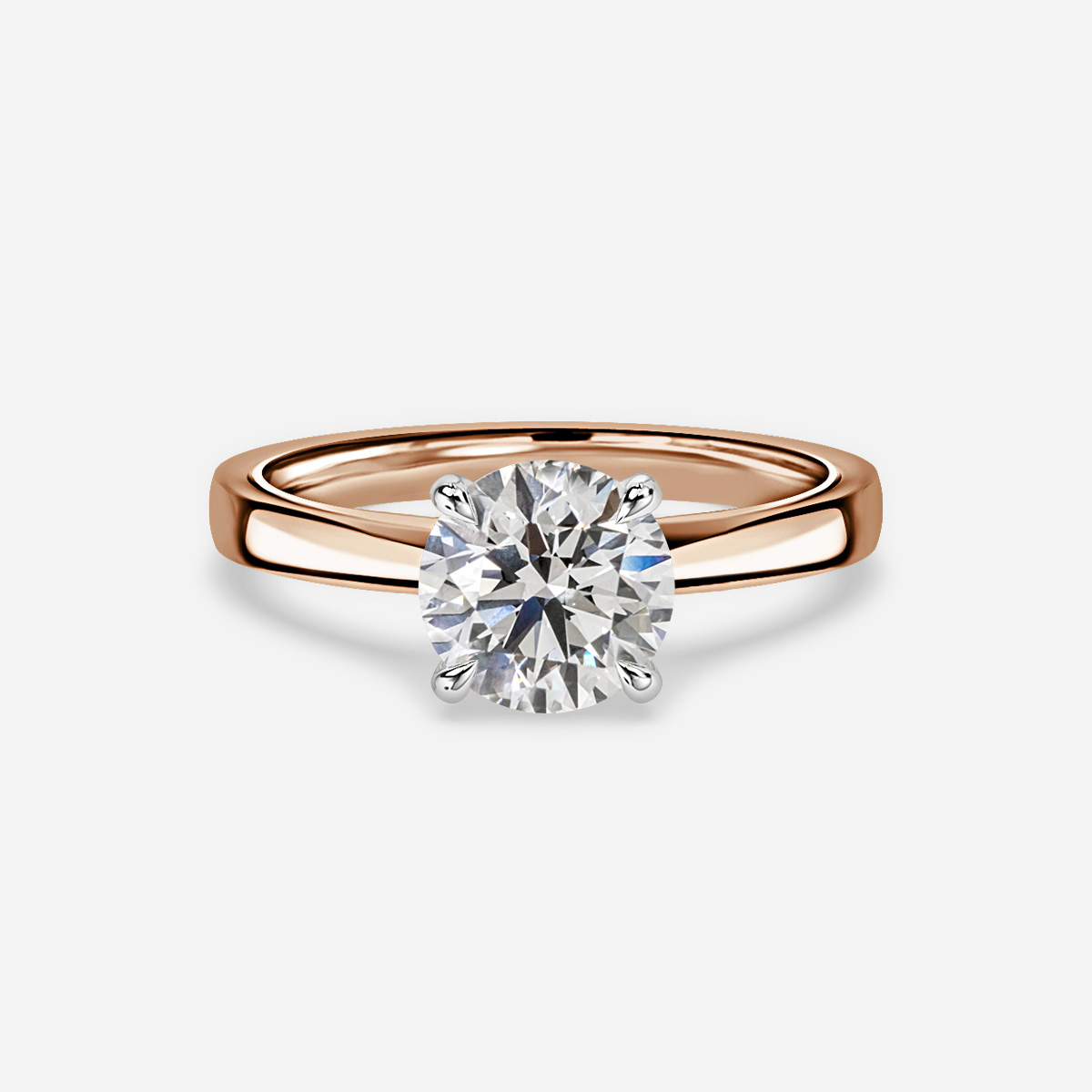 Classic and refined, this exquisite tulip rose gold two tone solitaire engagement ring features a shape of your choice diamond that sits within a four prong basket setting. Handcrafted in Hatton Gardens, London. Centre Diamond Not Included Setting Only