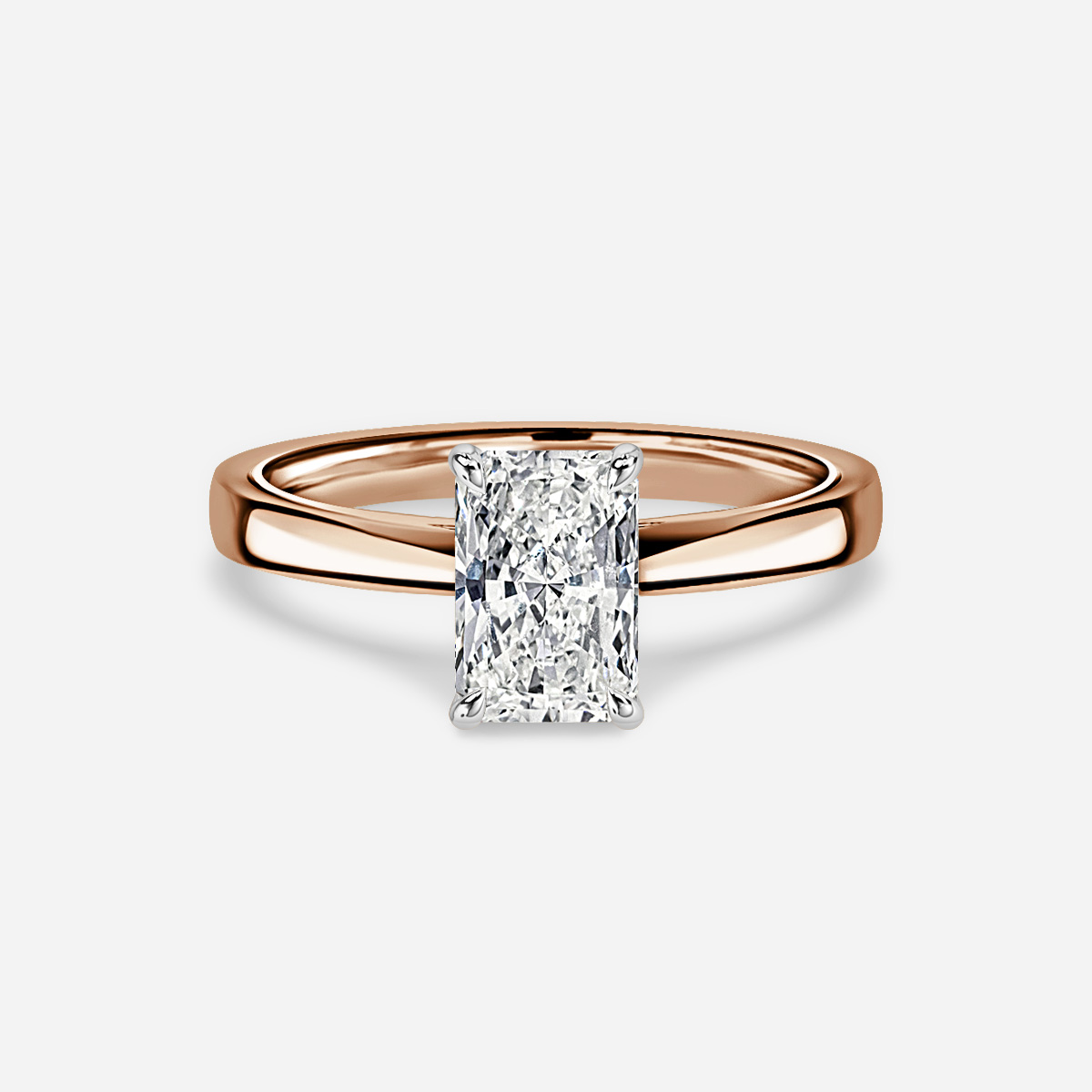 Classic and refined, this exquisite tulip rose gold two tone solitaire engagement ring features a shape of your choice diamond that sits within a four prong basket setting. Handcrafted in Hatton Gardens, London. Centre Diamond Not Included Setting Only