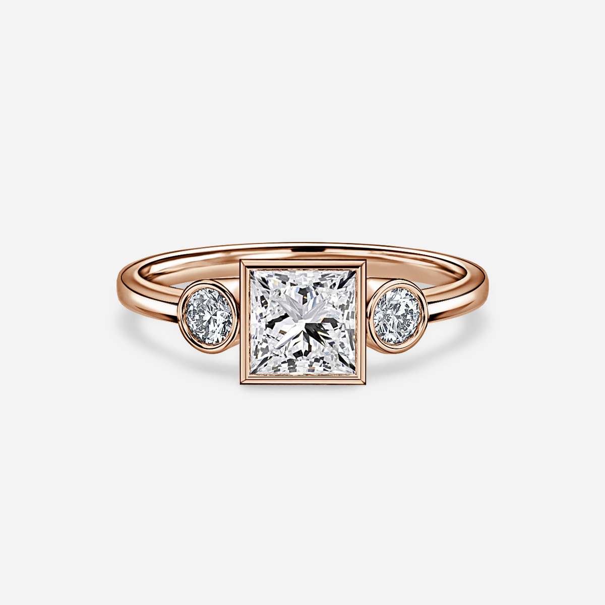 The Varani Rose Gold Rub-Over Three Stone Engagement Ring captivates with its sophisticated allure, boasting a central round diamond seamlessly set within a rub-over design. Flanked on either side are two equally dazzling round diamonds, collectively symbolizing enduring love and elegance in its finest form. Handcrafted in Hatton Garden, London Centre Diamond Not Included Setting Only