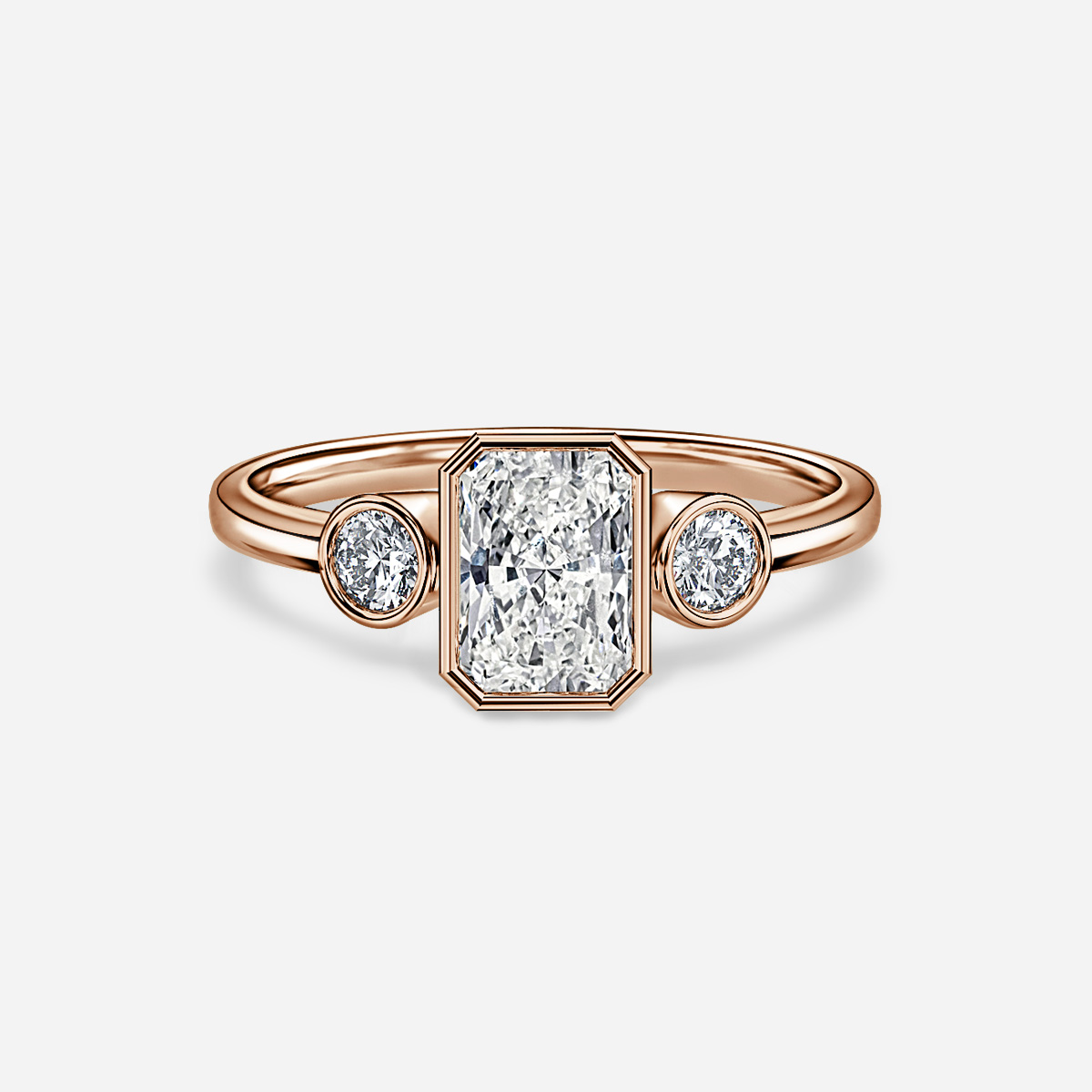The Varani Rose Gold Bezel Engagement Ring exudes timeless elegance with its exquisite design, featuring a radiant round diamond delicately embraced by a rose gold bezel setting. Complemented by two additional sparkling round diamonds on each side, this ring epitomizes sophistication and symbolizes everlasting love. Handcrafted in Hatton Garden, London Centre Diamond Not Included Setting Only
