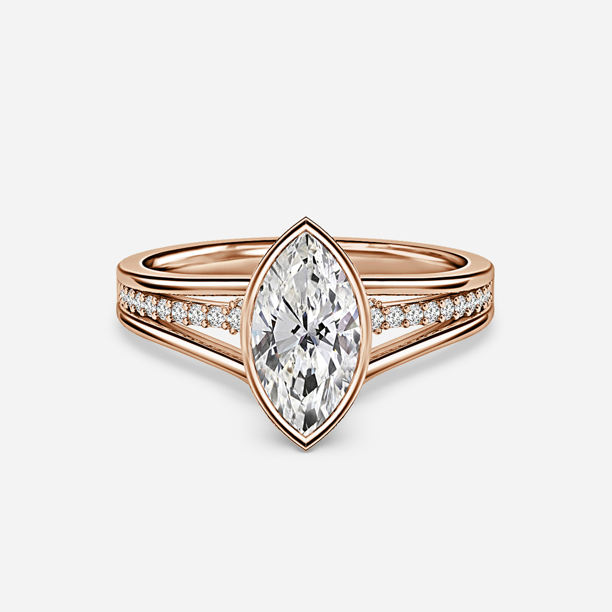 Elevate your love story with the Veda Rose Gold Bezel Engagement Ring, featuring a stunning diamond cascading from band to bridge along a gracefully split shank. Embrace the allure of intricate design and unparalleled beauty in this symbol of eternal devotion. Handcrafted in Hatton Gardens, London. Centre Diamond Not Included Setting Only