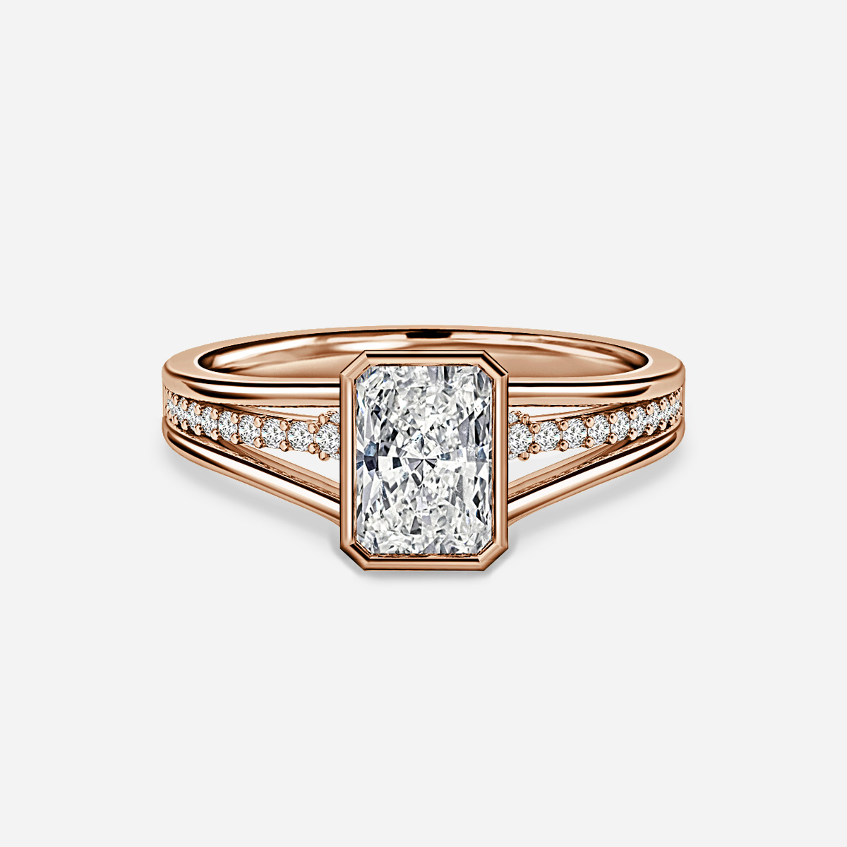 Elevate your love story with the Veda Rose Gold Bezel Engagement Ring, featuring a stunning diamond cascading from band to bridge along a gracefully split shank. Embrace the allure of intricate design and unparalleled beauty in this symbol of eternal devotion. Handcrafted in Hatton Gardens, London. Centre Diamond Not Included Setting Only