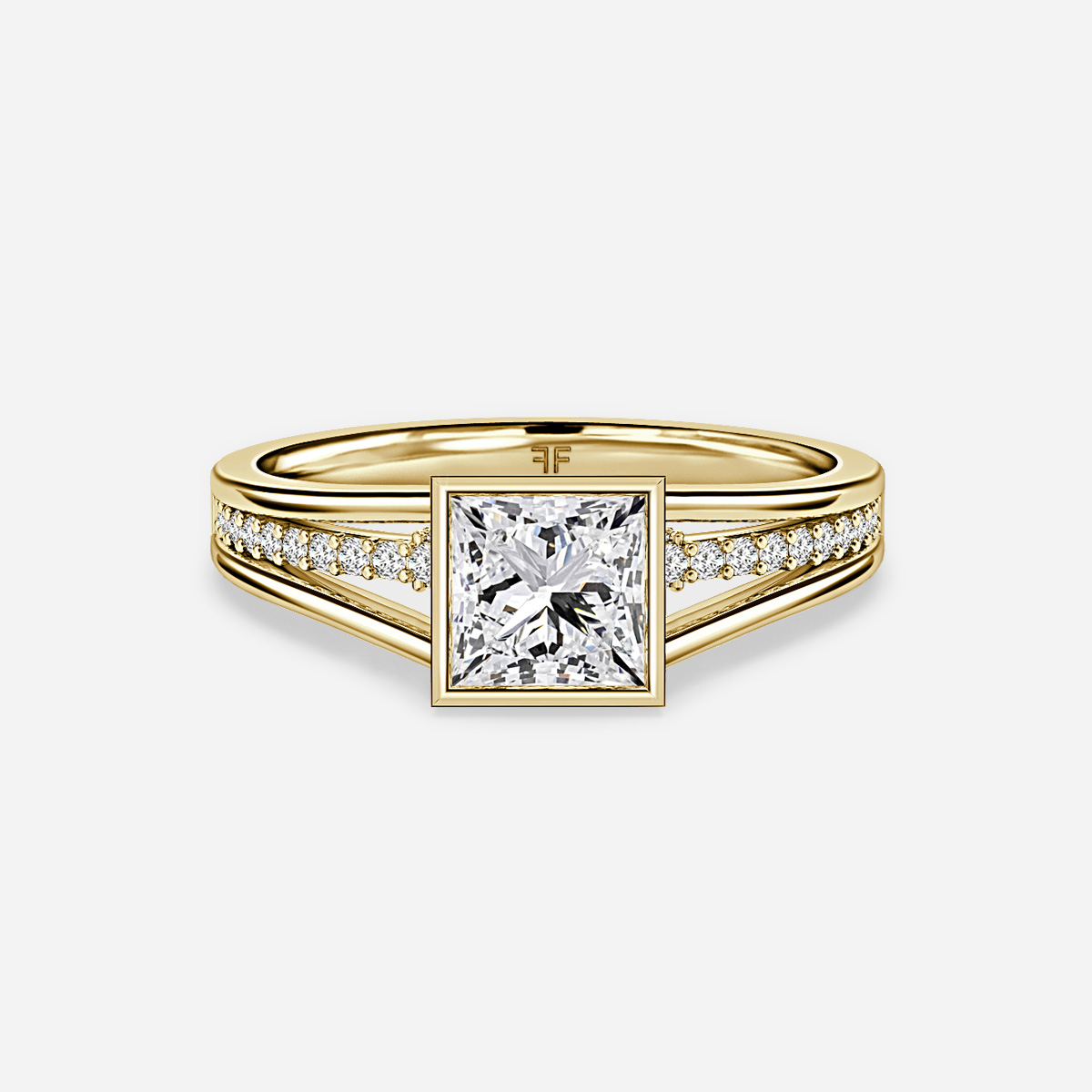 Elevate your love story with the Veda Yellow Gold Bezel Engagement Ring, featuring a stunning diamond cascading from band to bridge along a gracefully split shank. Embrace the allure of intricate design and unparalleled beauty in this symbol of eternal devotion. Handcrafted in Hatton Gardens, London. Centre Diamond Not Included Setting Only