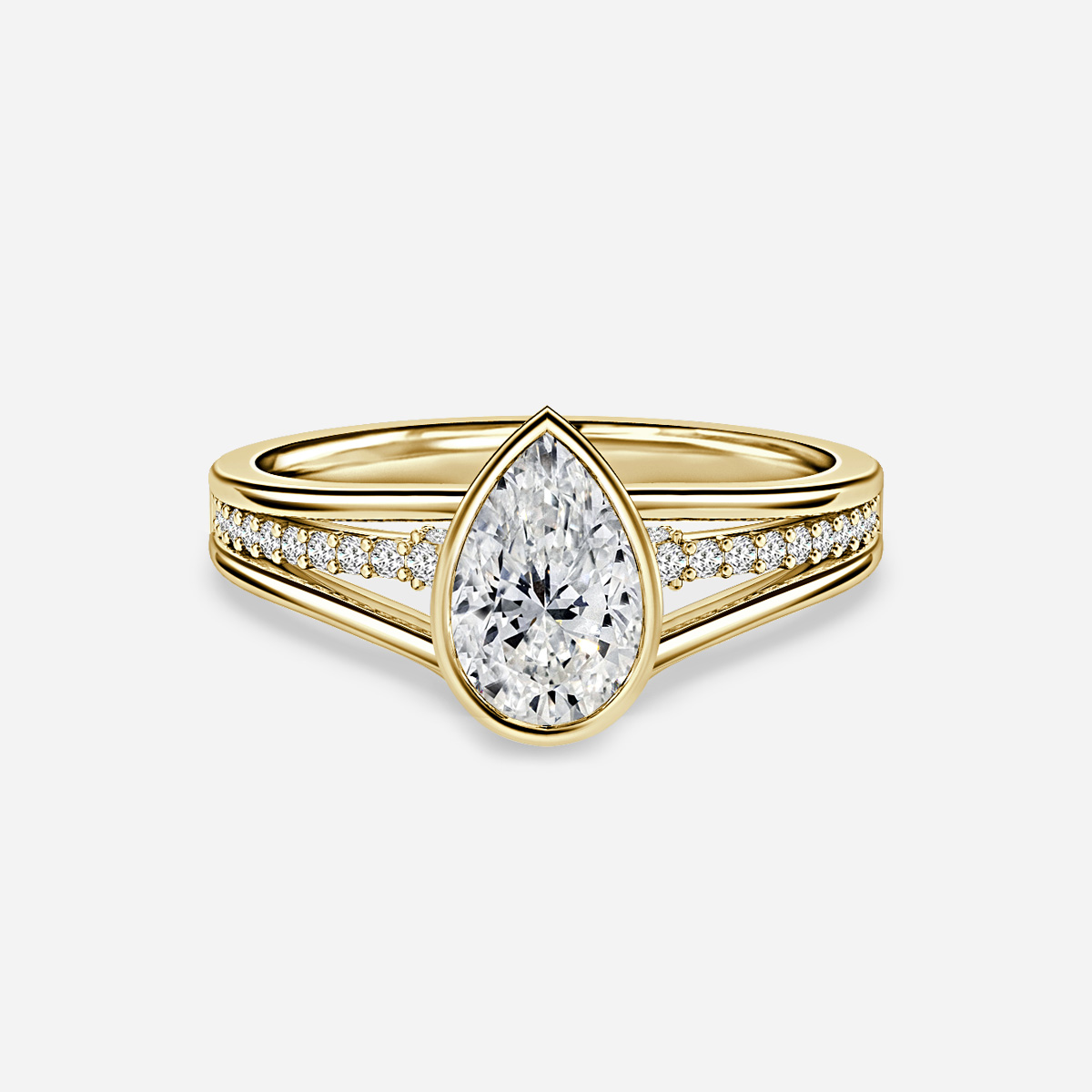 Discover the exquisite craftsmanship of the Veda Yellow Gold Diamond Band Engagement Ring, featuring a unique splitting shank design. One medium shank dazzles with diamonds extending from the band to the bridge, crafting a mesmerizing symphony of sparkle and artistry. Handcrafted in Hatton Gardens, London. Centre Diamond Not Included Setting Only