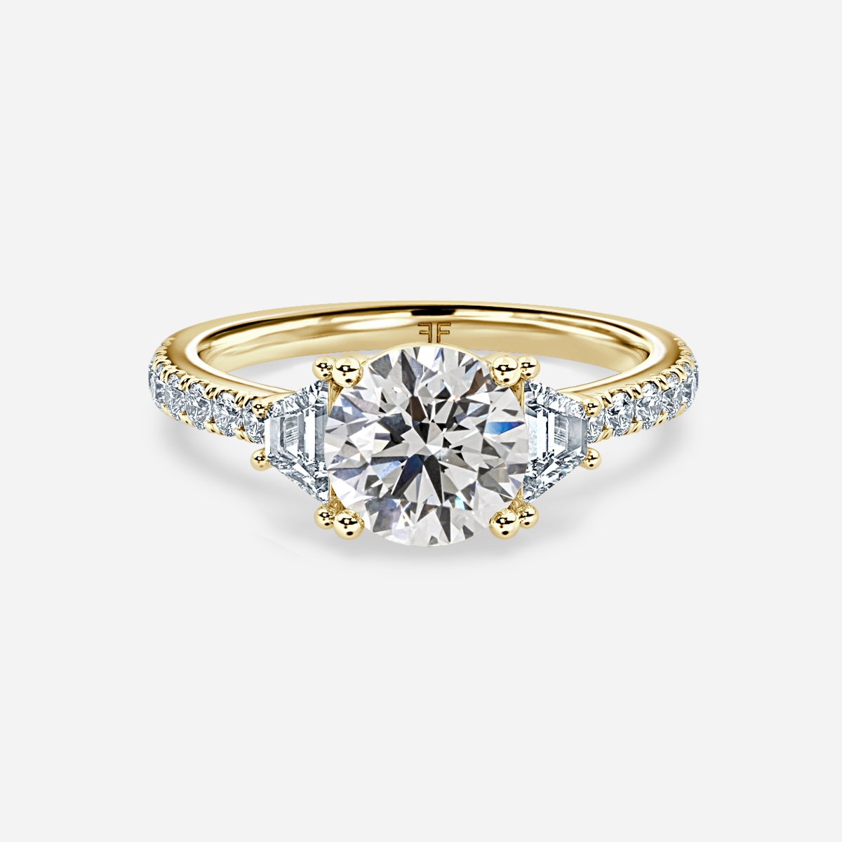 The Vedette ring showcases a captivating center diamond, flanked by trapezoid side stones that enhance its brilliance. A pavé-set band completes the design, adding a continuous sparkle from every angle. Handcrafted in Hatton Gardens, London. Setting only