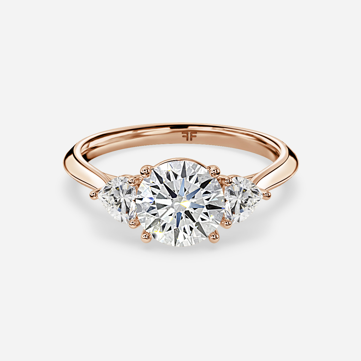 A rose gold "trilogy engagement ring" is a classic design featuring "three diamonds" of the same size, symbolizing the "past, present, and future" of the couple, typically set on a simple "band". It is a sentimental choice for an engagement ring. Handcrafted in Hatton Gardens, London. Centre Diamond Not Included Setting only.