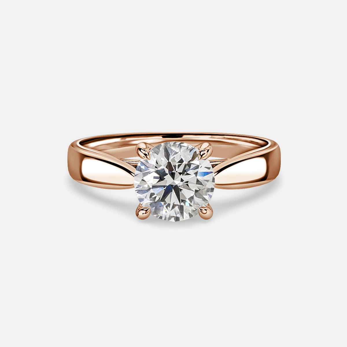 Classic and refined, this rose gold solitaire engagement ring with a plain band and features a round cut diamond that sits within a four prong setting. Handcrafted in Hatton Gardens, London. Centre Diamond Not Included Setting Only