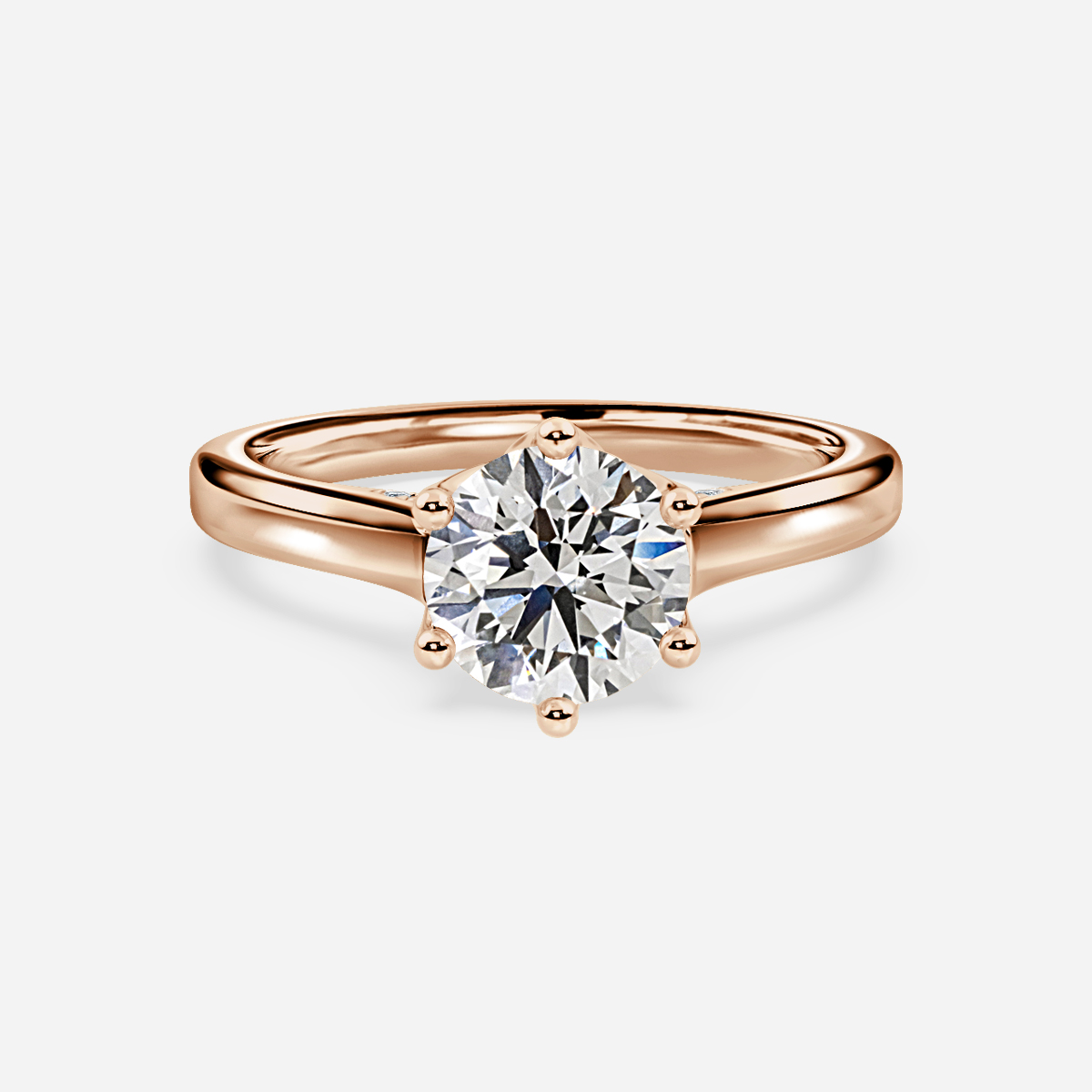 A six prong rose gold engagement ring with a diamond set bridge is a beautiful and timeless choice for any bride-to-be. The six prongs provide a secure setting for the center diamond, while the diamond bridge adds unique detail and extra sparkle. Handcrafted in Hatton Garden, London Centre Diamond Not Included Setting Only