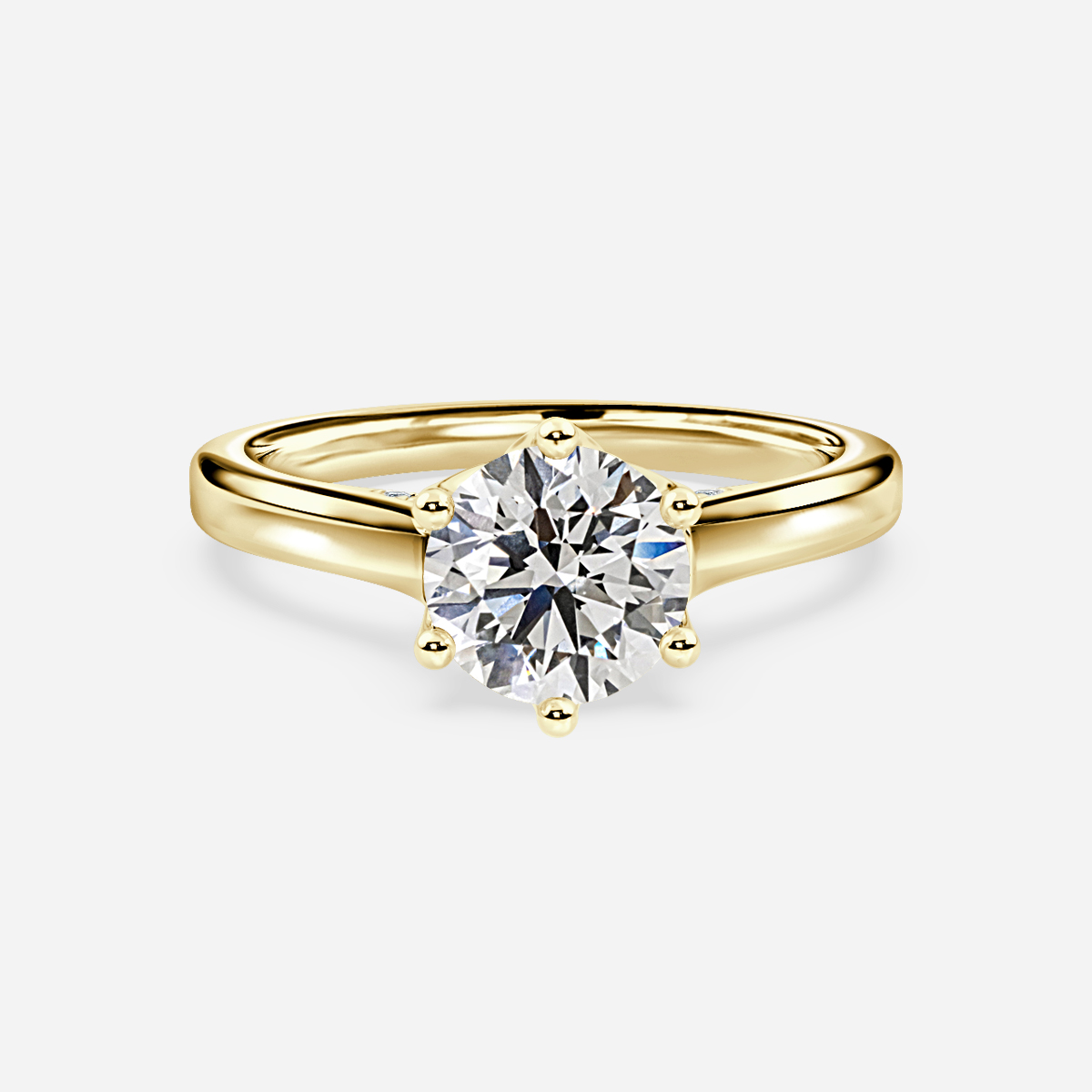 A six prong yellow gold engagement ring with a diamond set bridge is a beautiful and timeless choice for any bride-to-be. The six prongs provide a secure setting for the center diamond, while the diamond bridge adds unique detail and extra sparkle. Handcrafted in Hatton Garden, London Centre Diamond Not Included Setting Only