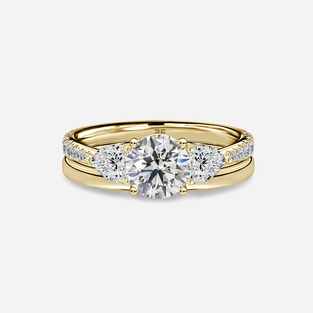 Experience timeless elegance with the Vivian Yellow Gold Plain Band Bridal Set Engagement Ring. Crafted with a trilogy design adorned by pear-shaped side stones flanking the center diamond, it is exquisitely paired with a plain band wedding band for a sophisticated and sparkling symbol of enduring love. Handcrafted in Hatton Garden, London. Centre Diamond Not Included Setting Only