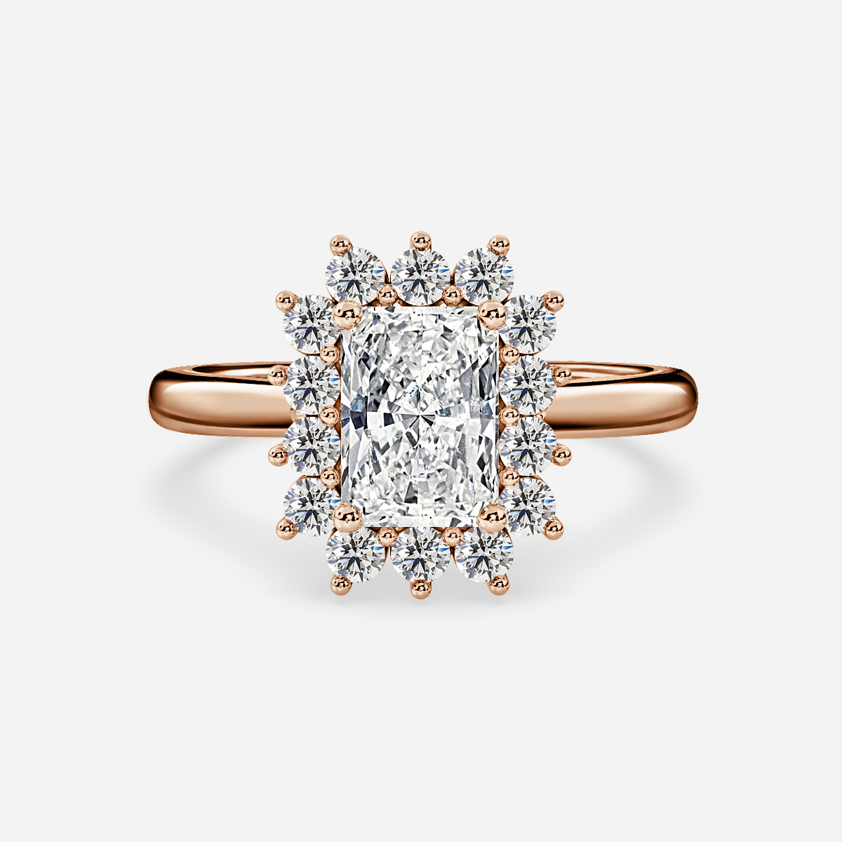 The Windermere is a bold design with an intricate basket which cradles the stones in finely polished claws. The silhouette of the small diamonds in the cluster halo are reminiscent of the petals in a forget-me-not flower. Handcrafted in Hatton Garden, London. Diamond Center Not Included, Setting only