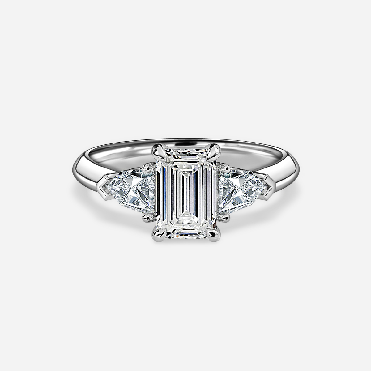 A platinum trilogy diamond is held in a classic four-prong setting and accented by two bullets shape side diamonds. Handcrafted in Hatton Gardens, London. Centre Diamond Not Included Setting only