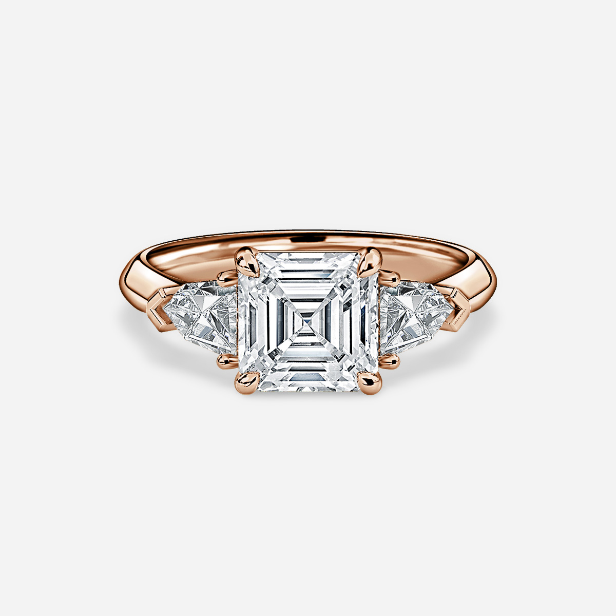 A rose gold trilogy diamond is held in a classic four-prong setting and accented by two bullets shape side diamonds. Handcrafted in Hatton Gardens, London. Centre Diamond Not Included Setting only