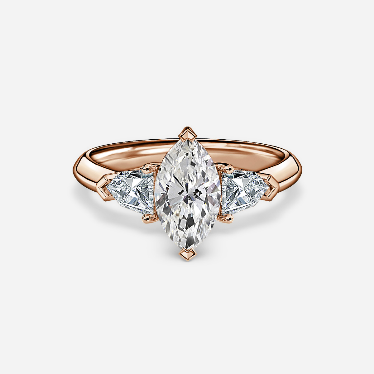 A rose gold trilogy diamond is held in a classic four-prong setting and accented by two bullets shape side diamonds. Handcrafted in Hatton Gardens, London. Centre Diamond Not Included Setting only
