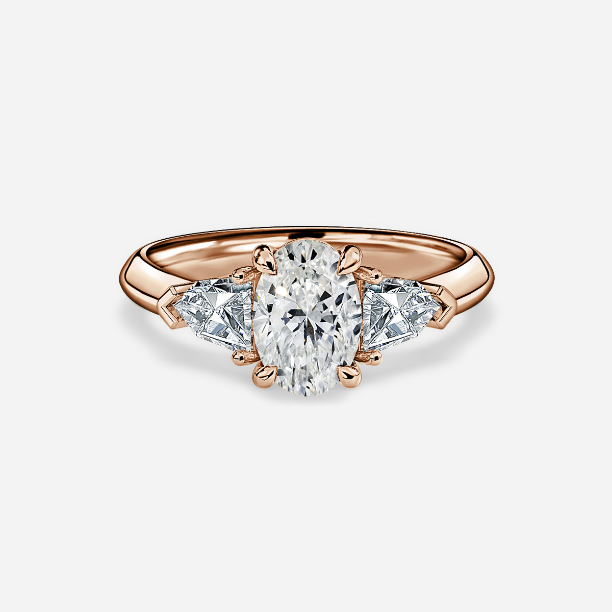 A rose gold trilogy diamond is held in a classic four-prong setting and accented by two bullets shape side diamonds. Handcrafted in Hatton Gardens, London. Centre Diamond Not Included Setting only
