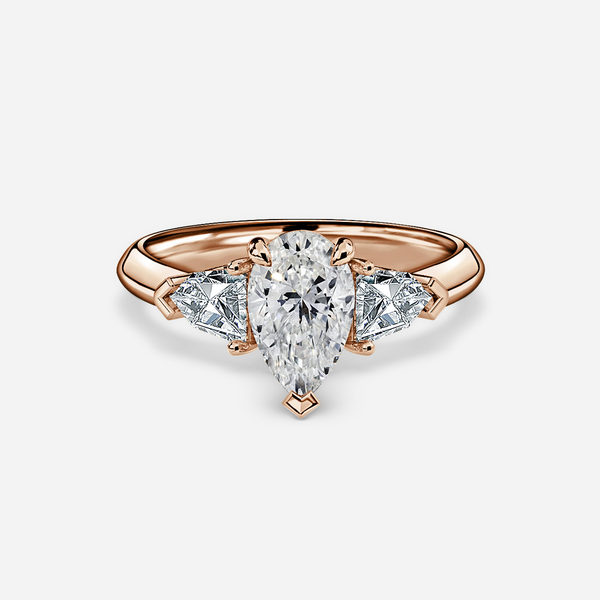 A rose gold trilogy diamond is held in a classic four-prong setting and accented by two bullets shape side diamonds. Handcrafted in Hatton Gardens, London. Centre Diamond Not Included Setting only