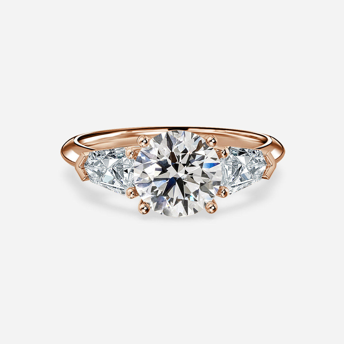 A rose gold trilogy diamond is held in a classic four-prong setting and accented by two bullets shape side diamonds. Handcrafted in Hatton Gardens, London. Centre Diamond Not Included Setting only