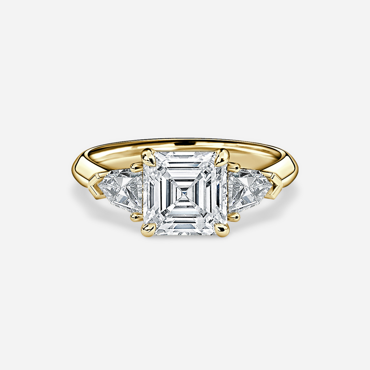 A yellow gold trilogy diamond is held in a classic four-prong setting and accented by two bullets shape side diamonds. Handcrafted in Hatton Gardens, London. Centre Diamond Not Included Setting only