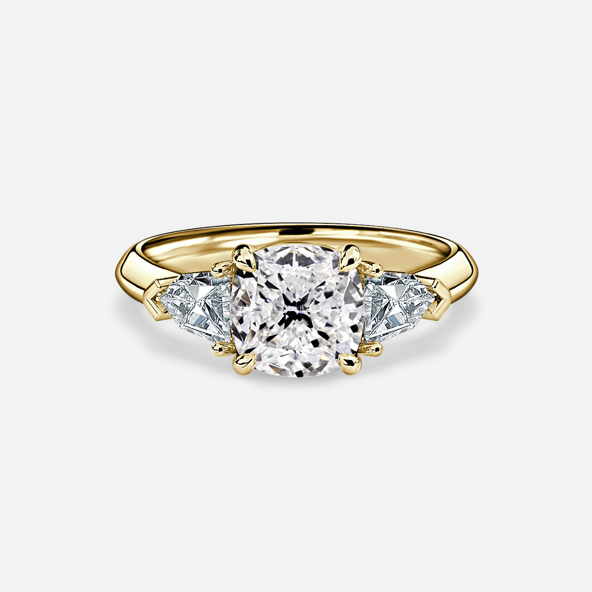 A yellow gold trilogy diamond is held in a classic four-prong setting and accented by two bullets shape side diamonds. Handcrafted in Hatton Gardens, London. Centre Diamond Not Included Setting only