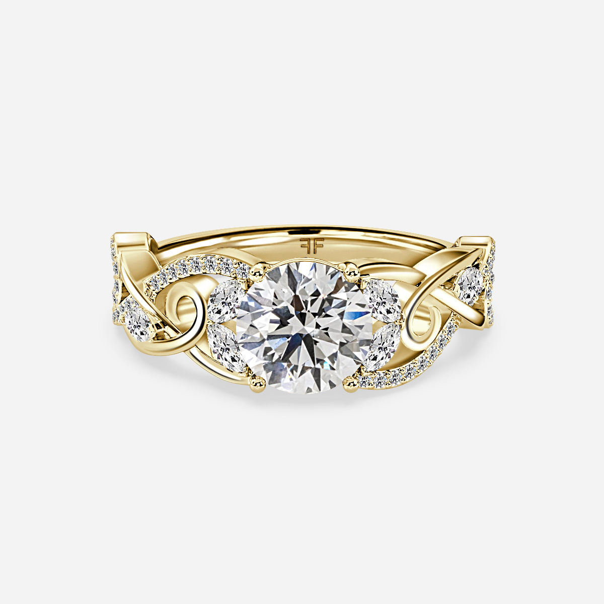 Elegantly intertwining yellow gold celtic knots adorned with a brilliant row of marquise diamonds on each side, accentuating a mesmerizing diamond at its center. Delicate round diamonds on the interwoven knots add a touch of enchanting sparkle to this exquisite diamond engagement ring. Handcrafted in Hatton Garden, London Centre Diamond Not Included Setting Only