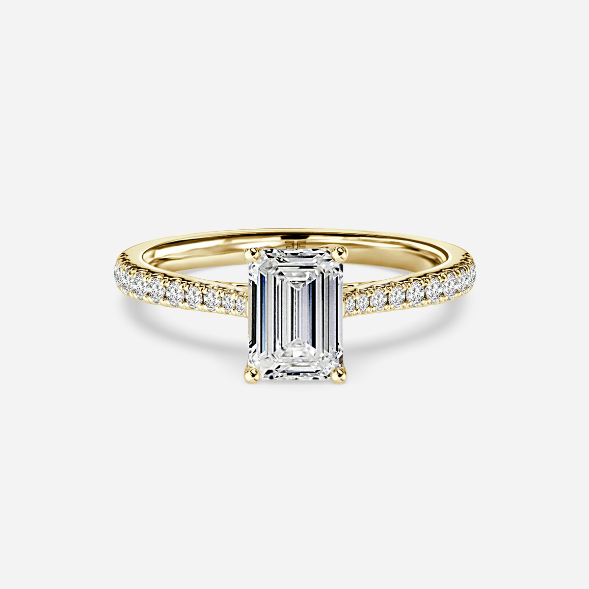 A yellow gold micro pave diamond engagement ring features a sparkling round diamond in the center, accents along the shoulders, and a timeless design perfect for celebrating this special moment. Handcrafted in Hatton Garden, London Centre Diamond Not Included Setting Only