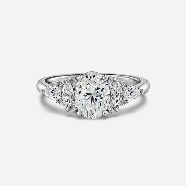 Pear, round, and tapered baguette side stones complement the oval center while maintaining balance and enhancing light reflection.